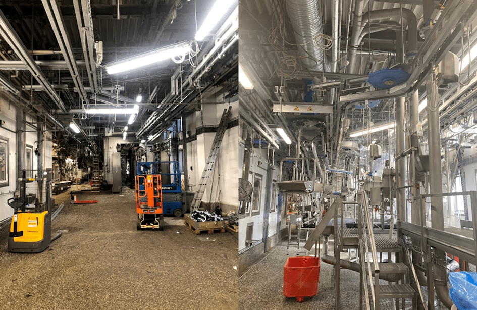 För att säkerhetsställa att produktionen kunde fortgå under installation byggdes en tillfällig passage till kylrummet. Detta för att vissa delar av befintlig produktionslinje skulle stängas av för att arbetet med montering av balk kunde påbörjas. Enligt plan stängde slakteriet ner produktionen för semester när den delen var klar och montering av balk, underbanor, vändhjul, rörbanor och kedja kunde fullföljas i resterande delar.